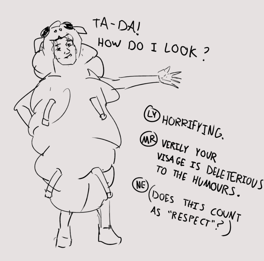 “Stuffy atmosphere, isn’t it? Look at all these people I made dress up just to greet you.”