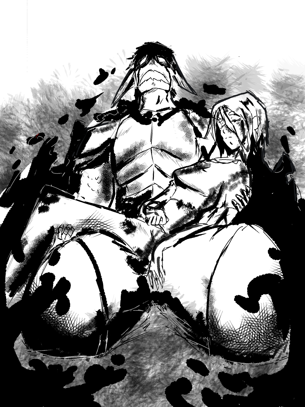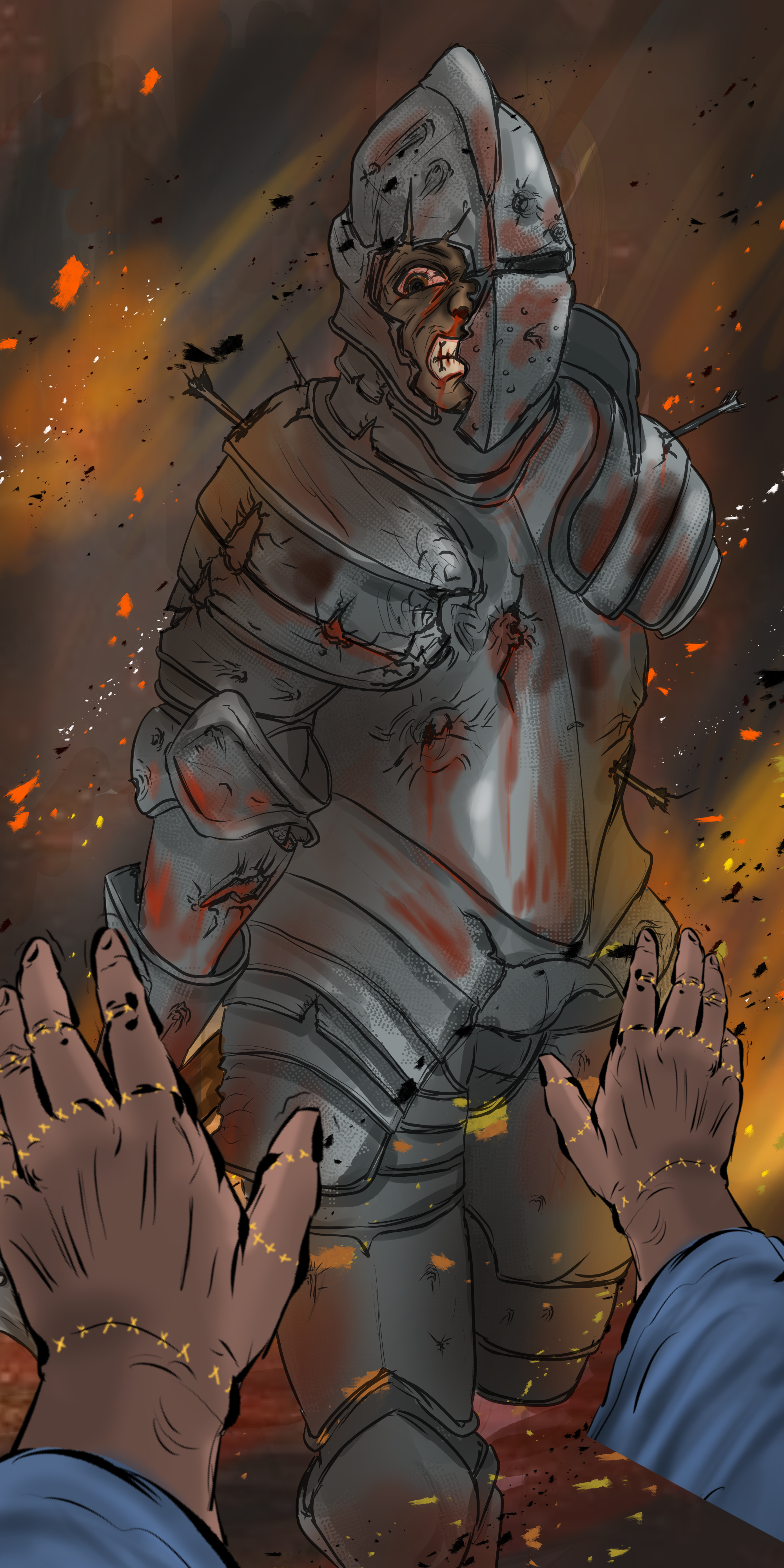 A knight in black armor, sword unbloodied, armor covered in gore.